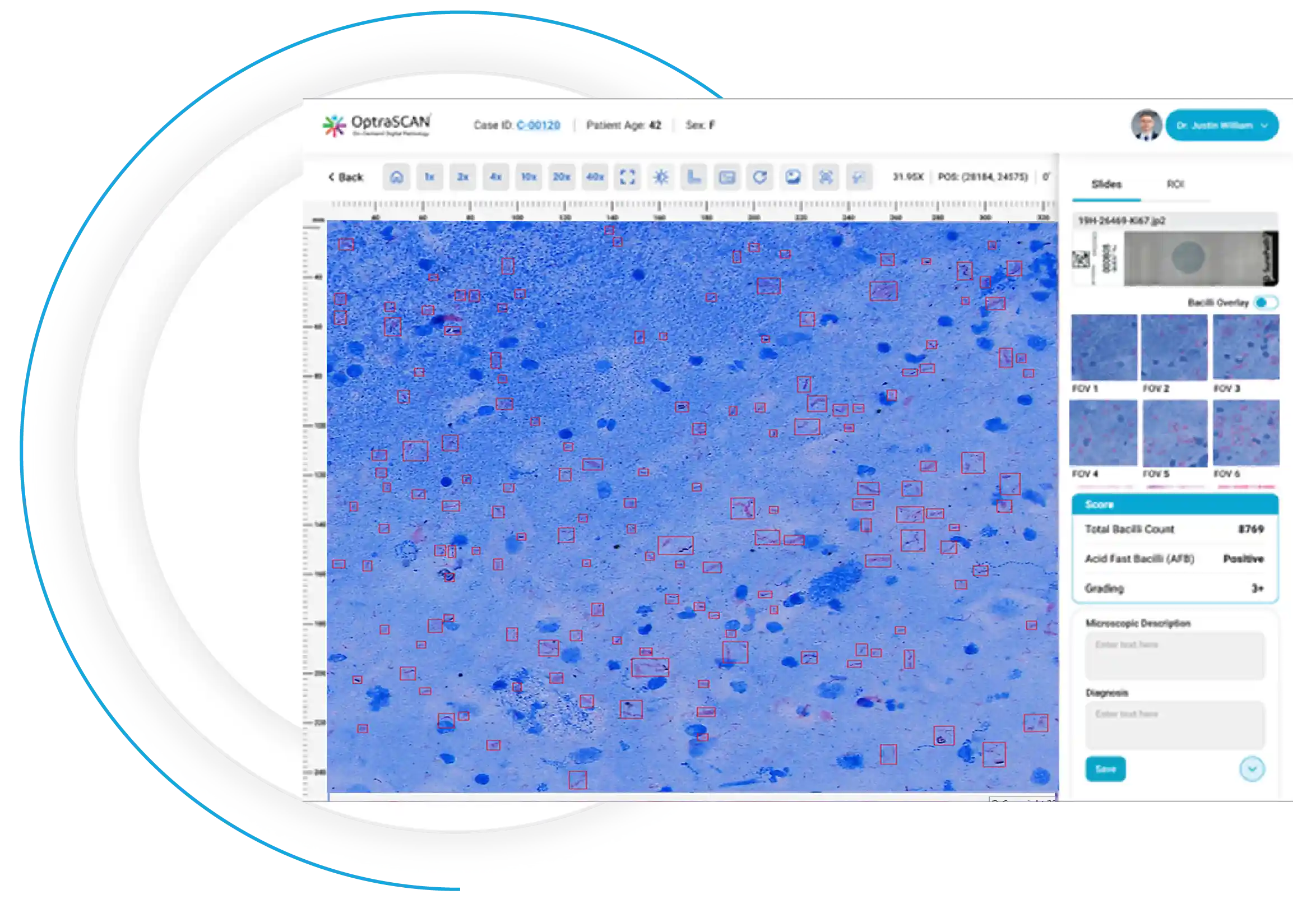 During acquisition, BactoSiA AI performs automated slide triage, marks FOVs, and triages slides as "likely negative" or "likely positive" to prioritize pathologist review. Confirmed positive smears are graded using standardized criteria aligned with WHO guidelines. All images and reports are managed digitally in IMAGEPath® software